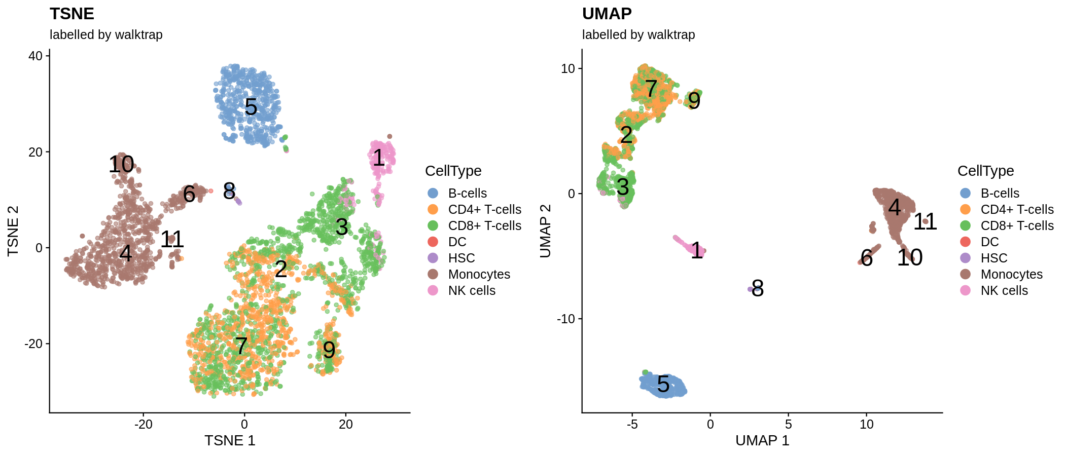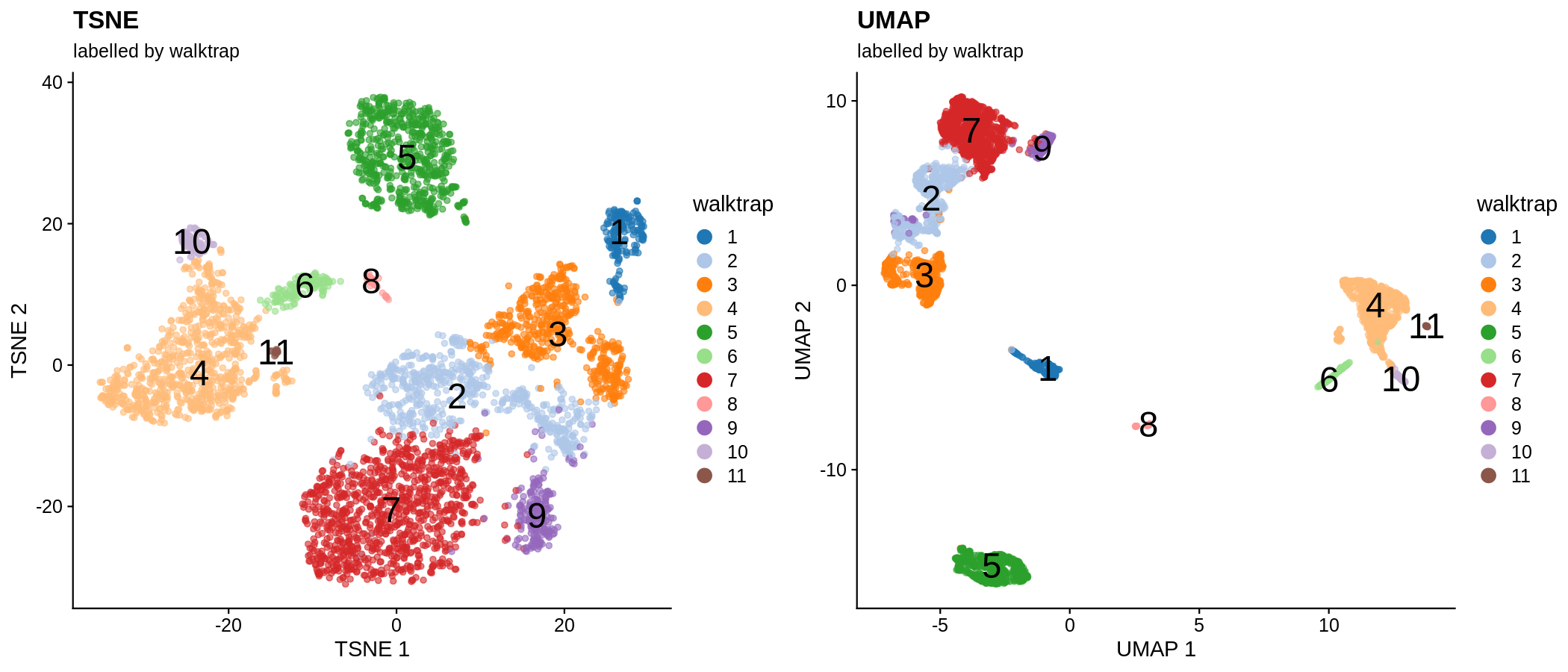 ggtitle("TSNE", subtitle = "labelled by walktrap")