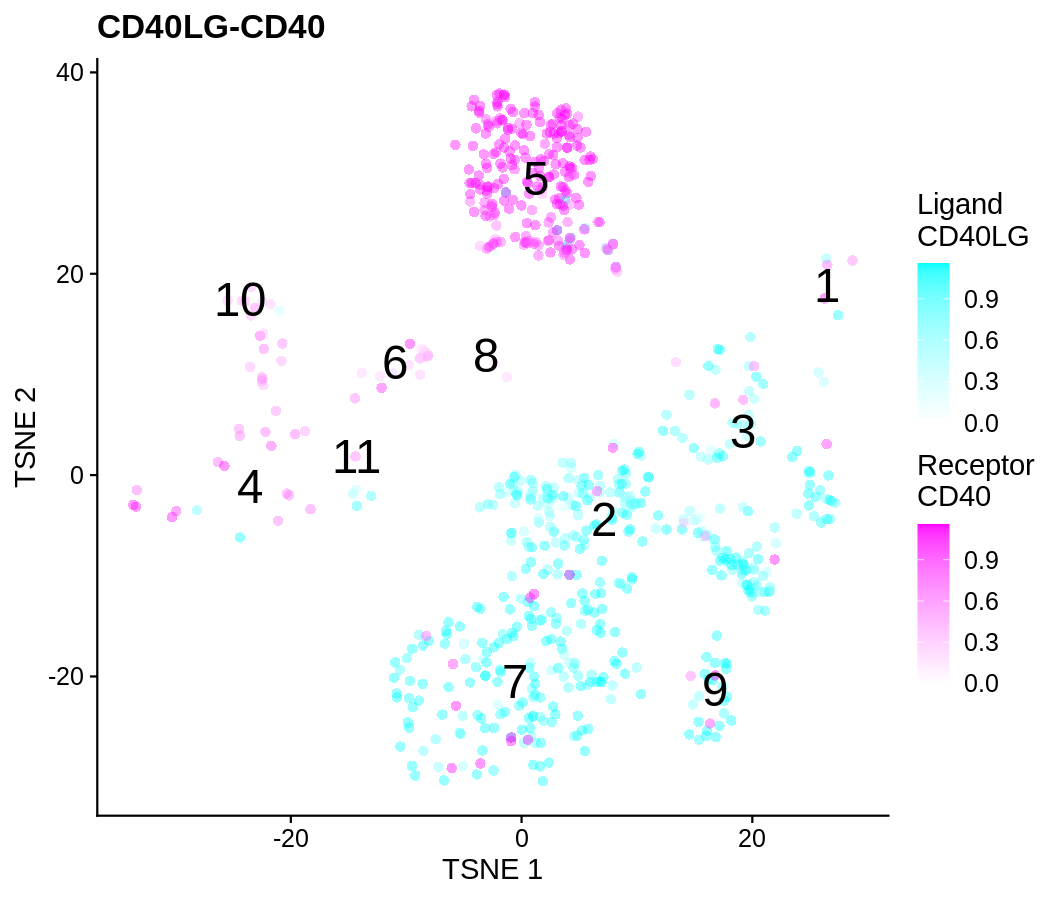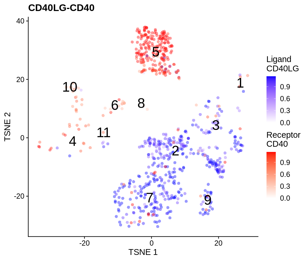 plotReducedDimLR(sce.pbmc, "TSNE", c("CD40LG","CD40"), text_by = "walktrap",