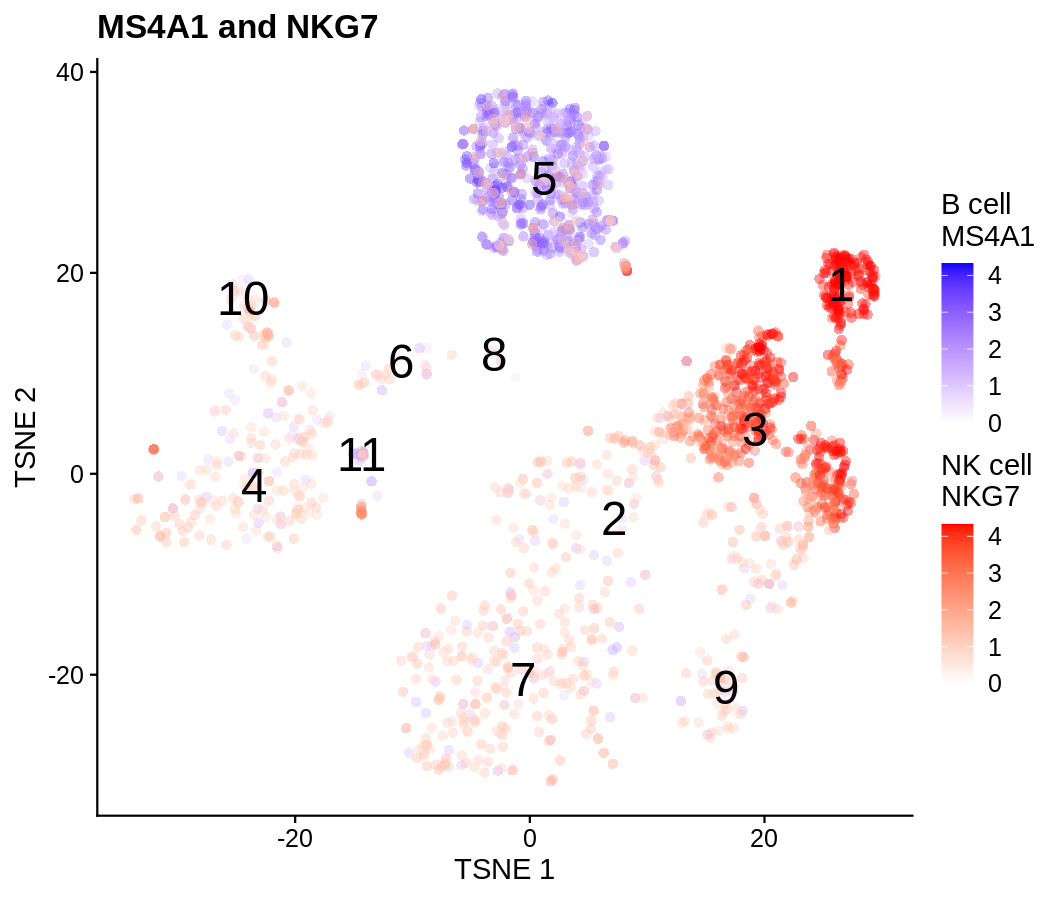 plotReducedDimLR(sce.pbmc, "TSNE", c("MS4A1","NKG7"), lr_desc = c("B cell","NK cell"),